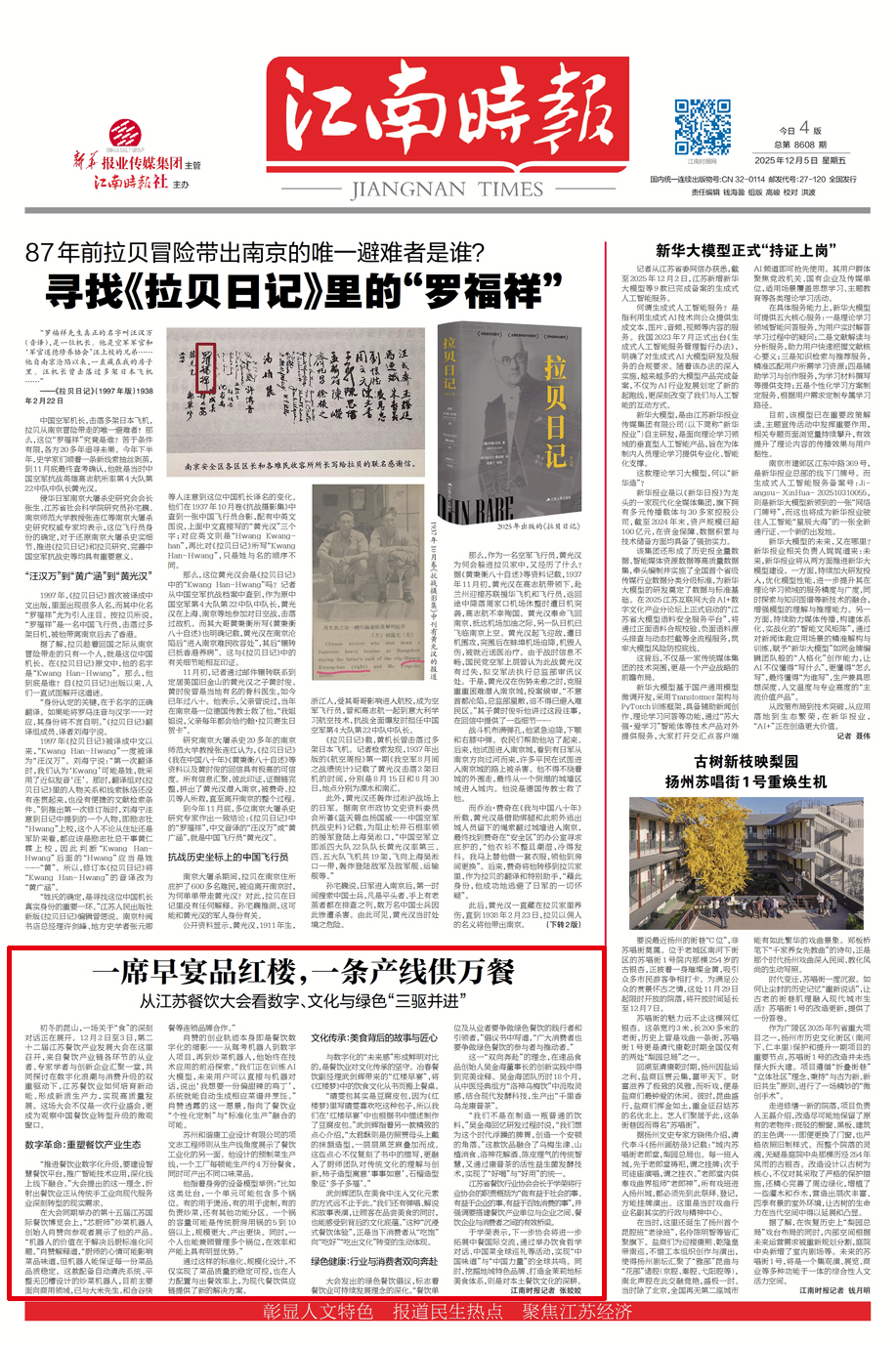 今日 4 ₪ 总第 8608 期 2025年12月5日 星期五 国内统一连续出版物号:CN 32-0114 邮发代号:27-120 全国发行 责任编辑 钱海盈 组版 高峻 校对 洪波 87年前拉贝冒险带出南京的唯一避难者是谁? 寻找《拉贝日记》里的"罗有 比自由家治局议 里。汪枫长曾击落过多架日本飞机 《校贝目记》(1997年版)193 年2月22日 空军机长 击意多里日本飞 么,这位"罗福祥"究竟是谁?苦于 有限,各方20多年追寻未果。 年 中学家们喷着 品新线索拍线测() 到11月底最终查考确认,他就是当时中 图文赋培成基地高速航班加盟 4大队等 22中队中队长黄光汉 大屠杀史研究会会 张生、江苏省社会科学院研究员孙容 氧真质大学教授张连红等演京 史研究权威专家均表示,这位飞行员身 份的确定,对于还顾南京大屠杀史 幣,推进《粒目日记》和粒团研究,然解中 国安军航战中部均具有重要意义 "身份认定的关键,在于名字的正矿 802136 如果維培罗马注音与汉字 应,其身份将不言自明。"《拉贝日记》副 译组成展,瑞盛馆团 年《拉贝日记》被译成中文以 来, x wang Han - Hwang 一度被译 为"正汉万" ...