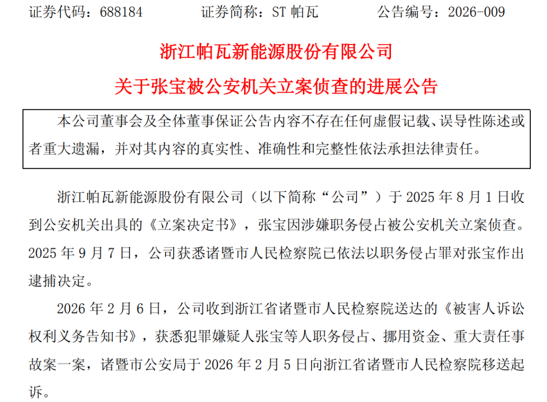 ST帕瓦2月6日晚间公告,公司于当日收到浙江省诸暨市人民检察院送达的《被害人诉讼权利义务告知书》,获悉犯罪嫌疑人张宝等人职务侵占、挪用资 金、重大责任事故案一案,诸暨市公安局于2月5日向浙江省诸暨市人民检察院移送起诉。 资料显示,张宝出生于1971年10月,中南大学冶金物理化学博士、化学工程与技术博士后。其历任中南大学助教、讲师、冶金科学与工程学院副研究员、 校团委书记、冶金与环境学院党委书记、博士生导师等职务。2018年7月起任ST帕瓦董事、总经理,2022年10月起任公司董事长。 截至2025年9月末,张宝持有ST帕瓦股票1656万股,持股比例10.41%,系公司第二大股东。据ST帕瓦2024年年报,张宝当年税前薪酬为120.08万元。 ST帕瓦主要从事医药产品的研发、生产、销售及相关健康服务。 ST帕瓦表示,截至公告披露日,公司生产经营情况一切正常,上述事项不会对公司日常经营活动产生重大影响。 2025年8月1日,ST帕瓦收到公安机关出具的《立案决定书》,张宝因涉嫌职务侵占被公安机关立案侦查。2025年9月7日,ST帕瓦获悉诸暨市人民检察院 已依法以职务侵占罪对张宝作出逮捕决定。 更早之前,2025年5 ...