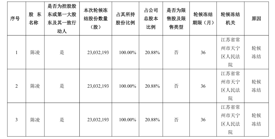 据天禄科技2月6日公告,该公司近日收到控股股东、实际控制人之一陈凌先生的通知,并通过中国证券登记结算有限责任公司系统查询,获悉陈凌所持 2303.22万股公司股份被轮候冻结,占其所持股份比例的100%,占公司总股本比例为20.88%。 | 序号 | 股 东 名称 | 是否为控股股 东或第一大股 | 本次轮候冻 | 占其所持 | 占公司 | 是否为限 | 轮候冻结 | 轮候冻结 | 原因 | | --- | --- | --- | --- | --- | --- | --- | --- | --- | --- | | | | 东及其一致行 动人 | 结股份数量 (股) | 股份比例 | 总股本 比例 | 售股及限 售类型 | 期限(月) | 机关 | | | | | | | | | | | 江苏省常 | | | | 陈凌 | 是 | 23,032,193 | 100.00% | 20.88% | を | 36 | 州市天宁 区人民法 | 轮候 冻结 | | | | | | | | | | 院 | | | | | | | | | | | 江苏省常 州市天宁 | 轮候 | | 2 | 陈凌 | 是 | 23,032 ...