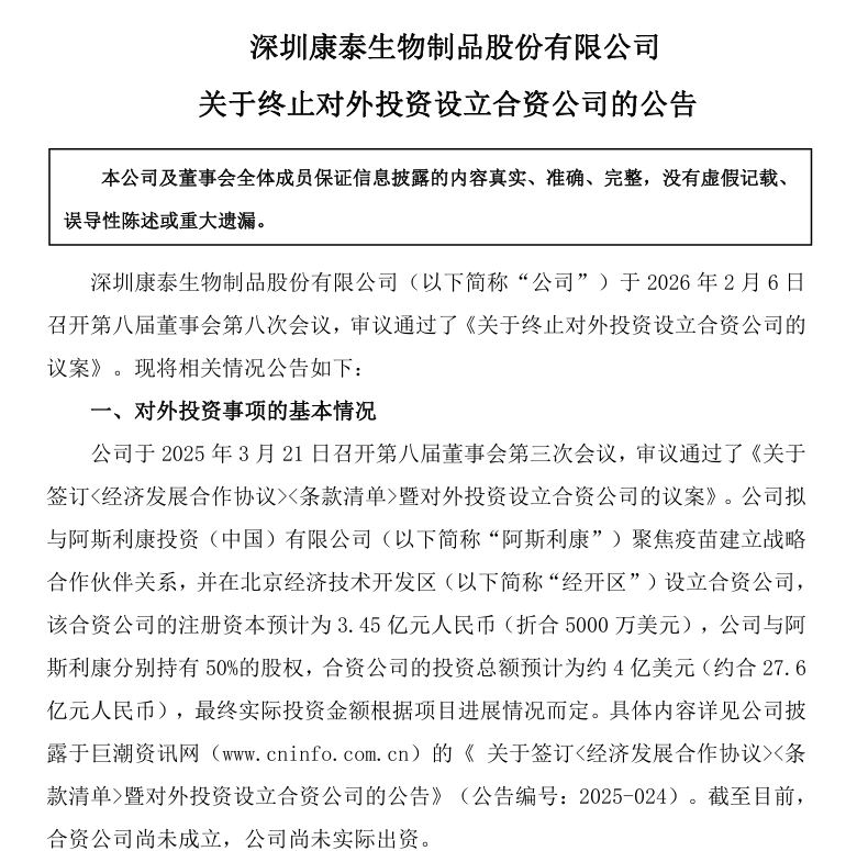 2月6日,康泰生物(300601)发布公告,称公司董事会审议通过议案,决定终止与阿斯利康投资(中国)有限公司合作设立疫苗领域合资公司的事项,此 次终止未对公司产生重大不利影响。 康泰生物强调,因本次对外投资尚未实际出资,终止事项不会对公司现有业务、财务状况和经营情况产生重大影响,也不会改变公司未来发展规划,不存 在损害公司及全体股东利益的情形。未来公司将继续围绕"内生创新+外延拓展"双轮驱动战略,整合内外部资源,深化国际业务布局,推动公司持续健康 发展。 深圳康泰生物制品股份有限公司的主营业务是人用疫苗的研发、生产和销售。公司的主要产品是13价肺炎球菌多糖结合疫苗、无细胞百白破b型流感嗜血 杆菌联合疫苗(四联苗)、冻干人用狂犬病疫苗(人二倍体细胞)、23价肺炎球菌多糖疫苗等。 作为疫苗企业,康泰生物近年在业务拓展方面受挫。去年1月,康泰生物宣布,经过公司审慎考量,为合理配置公司研发资源,聚焦研发优势项目,决定 终止新型冠状病毒灭活疫苗(Vero细胞)研发。 公告显示,新型冠状病毒灭活疫苗(Vero 细胞)用于预防由新型冠状病毒感染引起的流行性疾病。该疫 苗主要针对新冠病毒原始株进行抗原设计和研发,结合新型冠状 ...