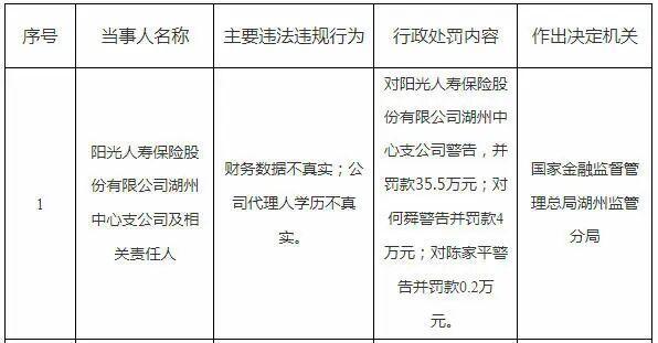 国家金融监督管理总局湖州监管分局10月21日披露的行政处罚信息公开表,剑指阳光人寿保险股份有限公司湖州中心支公司及相关责任人。 今年以来,阳光人寿保险股份有限公司及其下属公司频频遭监管处罚,违法违规行为包括欺骗投保人、编制提供虚假报告资料、给予投保人或被 保险人保险合同约定以外利益、未按照规定使用经备案的保险费率等。 其中,8月1日,阳光人寿保险股份有限公司因编制提供虚假报告资料、资金运用管理不到位、未按照规定使用经批准或备案的条款费率、电销业 务存在误导销售和用语不规范问题等,被罚款221万元;董迎秋、段宁、聂锐、边异、刘仁山、李建忠、范成江等责任人员受到警告,合计被罚 款70万元。 公开资料显示,阳光人寿保险股份有限公司成立于2007年,系阳光保险集团成员,位于海南省三亚市,是一家以从事保险业为主的企业。 前几日,阳光人寿两家支公司也收到了罚单。 10月17日,国家金融监督管理总局河北监管局发布的行政处罚信息显示,因分支机构撤销过程中管理不善,导致许可证遗失,阳光人寿保险股份 有限公司石家庄中心支公司被警告并罚款1万元;因管理不善导致许可证遗失,阳光人寿保险股份有限公司藁城支公司被警告并罚款1万元。 公告 ...