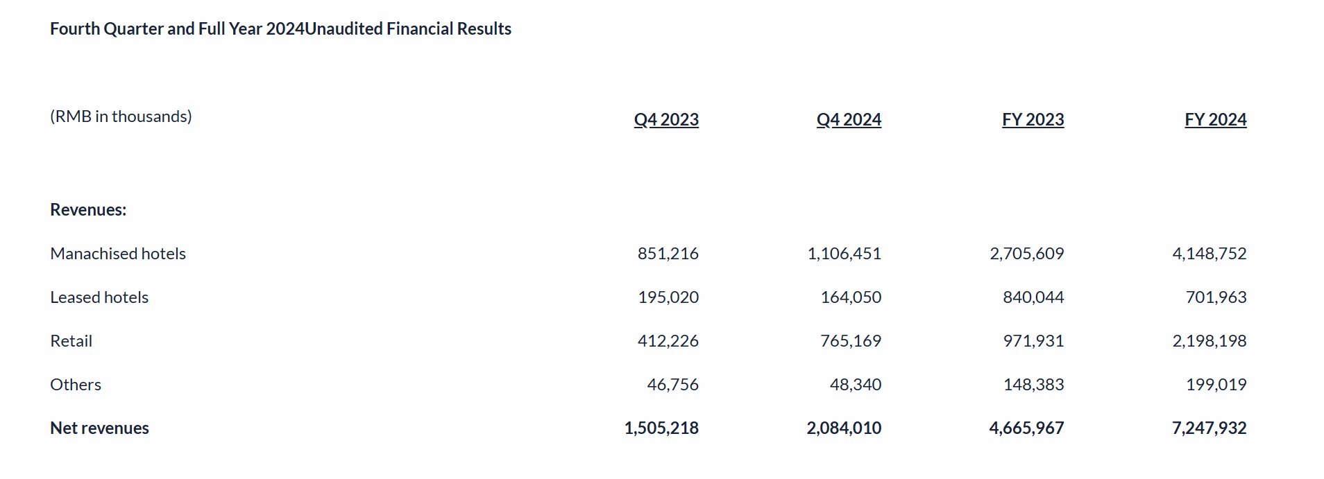 深圳商报·读创客户端记者 程茹欣 3月25日,连锁酒店品牌亚朵(纳斯达克股票代码:ATAT)发布最新业绩。数据显示,该公司2024年实现营收72.48亿元,同比增长55.3%;调整后净利润为 13.06亿元,同比增长44.6%。 尽管业绩增势喜人,亚朵股价却在25日大跌4%。26日,该股继续走低,截至收盘跌1.35%,报28.57美元/股,总市值39.31亿美元。 那么,市场反应为何不佳?亚朵交出的"成绩单"中究竟暴露出哪些隐患? 酒店主业增长失速 零售业务依赖爆款单品 资料显示,亚朵集团成立于2013年,2022年在美国上市,旗下拥有A.T.HOUSE、萨和酒店、亚朵S酒店、亚朵酒店、亚朵X酒店、轻居酒店六大住宿品牌, 以及零售品牌"αTOUR PLANET亚朵星球""SAVHE萨和"。 分业务来看,2024年,亚朵集团零售收入增速远超其酒店主业。数据显示,其来自管理加盟酒店的收入约41.49亿元,同比增长53.3%;来自租赁酒店的收入 约7.02亿元,同比减少16.4%。与2023年98.8%、51.9%的增速相比,亚朵2024年酒店主业增长明显放缓。 据亚朵透露,2024年,其深睡记忆枕PRO系列销量突 ...