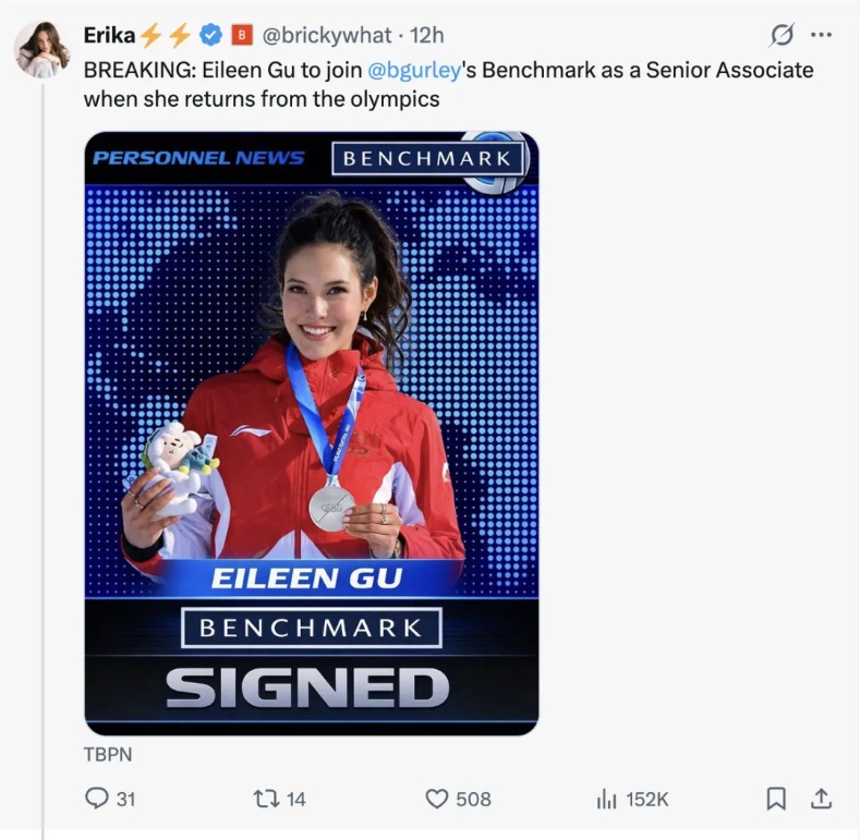 近期,一则所谓"重磅消息"在互联网上流传,指Benchmark传奇合伙人Bill Gurley证实,谷爱凌将入职硅谷风投Benchmark,任资深投资经理(Senior Associate)。 (文章来源:深圳商报) 北京时间2月14日0时左右,身在意大利参加米兰冬奥会的谷爱凌亲自在相关帖子下留言辟谣:"这不是真的"。 截至发稿时,这则谣言帖子已经删除。 ...