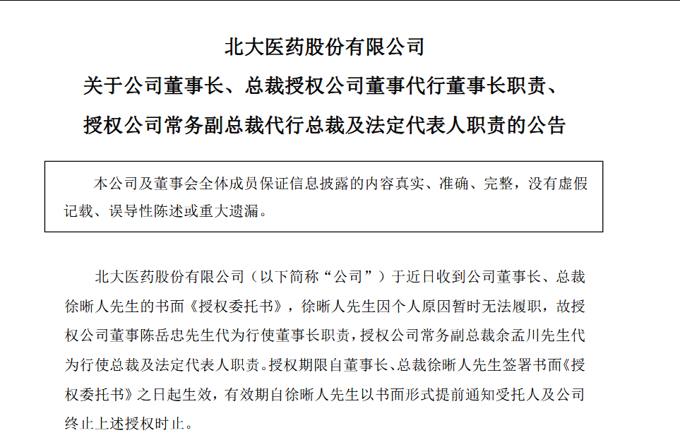 公告显示,北大医药股份有限公司(以下简称"公司")于近日收到公司董事长、总裁徐晰人先生的书面《授权委托书》,徐晰人先生因 个人原因暂时无法履职,故授权公司董事陈岳忠先生代为行使董事长职责,授权公司常务副总裁余孟川先生代为行使总裁及法定代表人 职责。授权期限自董事长、总裁徐晰人先生签署书面《授权委托书》之日起生效,有效期自徐晰人先生以书面形式提前通知受托人及公 司终止上述授权时止。 10月25日,北大医药(000788)发布关于公司董事长、总裁授权公司董事代行董事长职责、授权公司常务副总裁代行总裁及法定代表人 职责的公告。 北大医药称,截至本公告披露日,公司董事会运行正常,公司生产经营未受上述事项影响,生产经营情况稳定。公司将持续关注上述事 项的后续进展,并将严格按照有关法律、法规的规定和要求,及时履行信息披露义务。 公开资料显示,徐晰人1979年4月出生,浙江台州人,硕士学历,现任新优势产业集团有限公司董事长兼总经理、北大医药股份有限公司 董事长、总裁。 据北大医药此前公告,徐晰人曾担任过渣打银行上海浦西支行浙江业务部主任。据天眼查显示,目前徐晰人控制下的企业有59家,除北 大医药关联企业外,其余企业的业务涉 ...