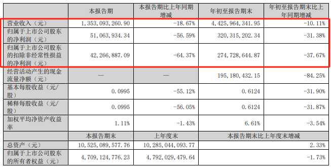 10月26日,双鹭药业披露2025年第三季度报告。前三季度公司实现营业总收入4.59亿元,同比下降15.13%;归母净利润1.41亿元,同比增长943.1%;扣非净 利润2933.49万元,同比下降62.39%;经营活动产生的现金流量净额为-583.17万元,上年同期为1.28亿元。 其中,第三季度,公司实现营业收入1.54亿元,同比增长3.63%;归母净利润2004.98万元,同比增长143.28%。 | | 本报告期 | 本报告期比上年同 | 年初 | | --- | --- | --- | --- | | | | 期增減 | | | 营业收入(元) | 153,893, 261. 65 | 3.63% | 4 | | 归属于上市公司股东的净 | 20, 049, 842. 08 | 143. 28% | | | 利润(元) | | | | | 归属于上市公司股东的扣 除非经常性损益的净利润 | 3, 330, 451. 32 | 107.83% | | | (元) | | | | | 经营活动产生的现金流量 | | | | | 浄额(元) | | | | | 基本每股收益(元/股) | 0. 0195 ...