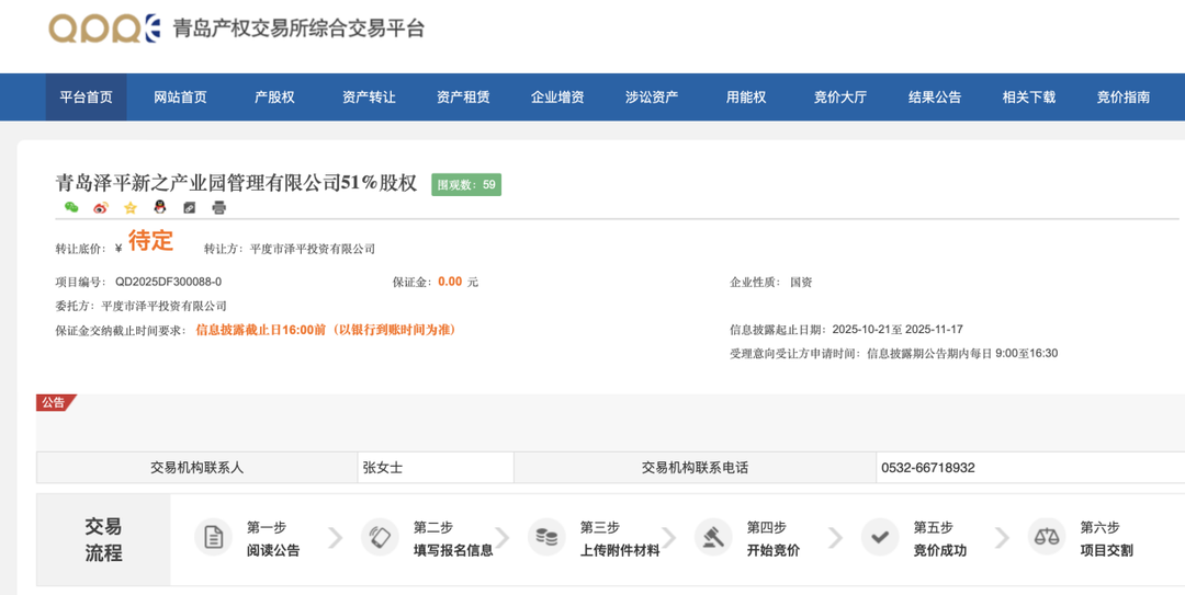10月21日,青岛产权交易中心发布公告显示,平度市泽平投资有限公司(简称"泽平投资")计划将青岛泽平新之产业园管理有限公司(简称"泽平新之产业园 公司")51%股权进行挂牌转让,转让价格待定。 | 平台首页 网站首页 | | 产股权 | 资产转让 | 资产租赁 | 企业增资 | 涉讼资产 | 用能权 | 竞价大厅 | 结果公告 | 相关下载 | 竞价指南 | | --- | --- | --- | --- | --- | --- | --- | --- | --- | --- | --- | --- | | 青岛泽平新之产业园管理有限公司51%股权 www. 59 | | | | | | | | | | | | | 96 ☆ 8 ■ ■ | | | | | | | | | | | | | 转让底价: ¥ 待定 | | | | | | | | | | | | | 项目编号:QD2025DF300088-0 | | | | 保证金:0.00 元 | | | 企业性质:国资 | | | | | | 委托方:平度市泽平投资有限公司 | | | | | | | | | | | | | 保证金交纳截止时间要求:信息披露截 ...