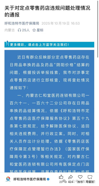 10月19日,内蒙古呼和浩特市医疗保障局发布的《关于对定点零售药店违规问题处理情况的通报》显 示,内蒙古仁和堂医药连锁有限公司旗下2家分公司存在日用品串换药品结算情况,被解除医保协议、 追回相关违规费用,并行政立案。 仁和堂医药官网显示,该公司2018年成立,是一家全国性医药连锁企业,拥有直营门店近1500家,营销 网络覆盖临沂、日照、菏泽、济宁、聊城、呼和浩特、乌海、包头等多个地市,连续6年荣获"中国连锁 药店直营力百强企业""中国连锁药店综合竞争力百强企业"称号。 在翔宇集团的规划中,旗下新三板挂牌企业翔宇药业和仁和堂医药都是重要的上市载体,2017年该集团 就曾表示,将推动仁和堂连锁的上市工作。2021年,山东省金融稳定发展领导小组印发《全省重点上市 后备企业名单》,包括仁和堂集团在内的临沂25家企业入围。(大众新闻.东烽财经记者) 记者注意到,本次被处罚的内蒙古仁和堂医药连锁有限公司此前多次出现违规情况,公司第一百五十七 分公司、第一百五十八分公司去年就曾被呼和浩特市医疗保障局通报存在串换药品刷医保、盗刷医保卡 问题,并被给予解除医保协议、1年内不得申报医保定点的处理。 据了解,内蒙古仁和堂医药连锁有 ...
