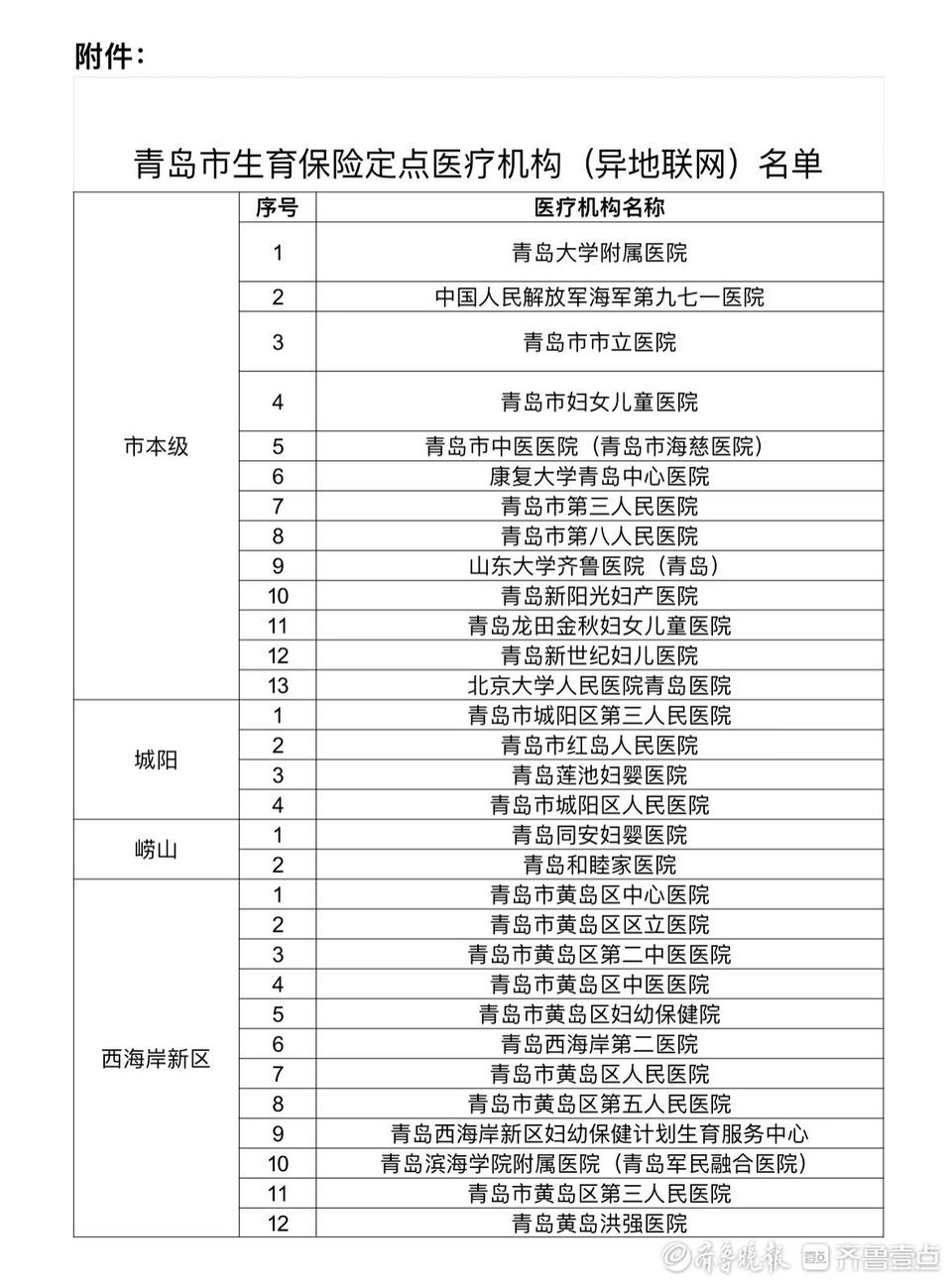 Core Points - Qingdao City will launch a direct settlement service for maternity medical expenses for insured individuals giving birth in other provinces starting from July 25, 2025, allowing for direct reimbursement without personal payment [1][2] - A total of 53 designated medical institutions in Qingdao are equipped to handle direct settlement for maternity expenses [1] - The direct settlement service eliminates the need for insured individuals to handle upfront payments and reduces administrative burdens associated with reimbursement [1] Summary by Category Direct Settlement Service - The new service allows insured individuals from Qingdao to give birth in other provinces and vice versa without the need for upfront payments [1] - The service is applicable to various childbirth scenarios, including single births and multiple births, both through natural and surgical means [1] Financial Details - For insured employees, there is no threshold for expenses covered under the plan, with reimbursements based on Qingdao's settlement standards [2] - The reimbursement limit for insured residents is set at 3,000 yuan, with any excess costs being the responsibility of the individual [2] Designated Medical Institutions - A comprehensive list of designated medical institutions for direct settlement has been provided, covering various districts and cities within Qingdao [3][4] - The institutions include major hospitals and specialized maternity care facilities, ensuring broad access for insured individuals [3][4]