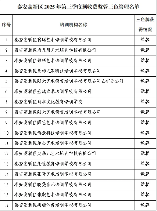 为进一步落实"双减"工作要求,强化预收费监管工作,泰安高新区社会事务部教体科根据《泰安市教育 局关于开展校外培训机构预收费专项监管工作的实施方案》要求,对区内面向中小学生的校外培训机构 2025年第三季度三个月的订单数、订单总额进行了核算,根据核算、检查结果确定出了"绿牌""黄 牌""红牌"机构。只有获得"绿牌"的校外培训机构方可正常开展培训业务并具备进入学校、幼儿园开展 课后服务的资格。被评为"黄牌"的校外培训机构应在教体科限定的期限内完成问题整改,整改完成经教 体科检查确认后,撤销其"黄牌"。被评为"红牌"的校外培训机构应立即停业整顿,并在1个月内完成问 题整改,整改完成由教体科检查审核,审核同意后,撤销其"红牌",方可继续开展培训活动。同时,建 议广大家长为孩子选择获得"绿牌"的校外培训机构参加培训。 | 18 | 泰安高新区乐之都艺术培训学校有限公司 | 绿脂 | | --- | --- | --- | | 19 | 泰安高新区西米艺术培训学校有限公司 | 绿牌 | | 20 | 泰安市泰山区字简艺术培训学校有限公司高新区分公司 | 绿牌 | | 21 | 泰安高新区万邦艺术培训学校有限公司 | 绿牌 ...