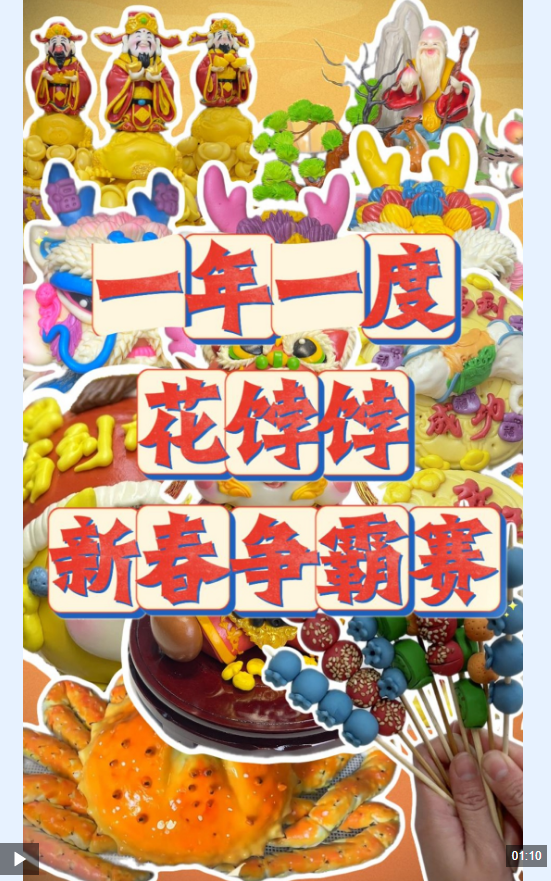 一顿火锅能有多少食材? 把帝王蟹拆开拢共分成几步? 萌趣福马能捏出多少花样? 锁定"一年一度花饽饽新春争霸赛" 新春的仪式感 尽在花饽饽的指尖功夫 鲜花衬果蔬 蟹肥年味足 揭晓答案! 财神送福 醒狮纳喜 松鹤延年 吉祥塔立 花饽饽把祝福玩出了"花" 看花饽饽如何承包马年年味 手工温度如何温暖团圆时光 寻味中国年 愿新岁"蒸蒸日上" 吉祥马盘 小马福袋 轮番亮相 马年好运被揉进每一寸面香 请把"马到成功"狠狠焊在身上 萌趣福马 马到成功 "蒸"棒! ...