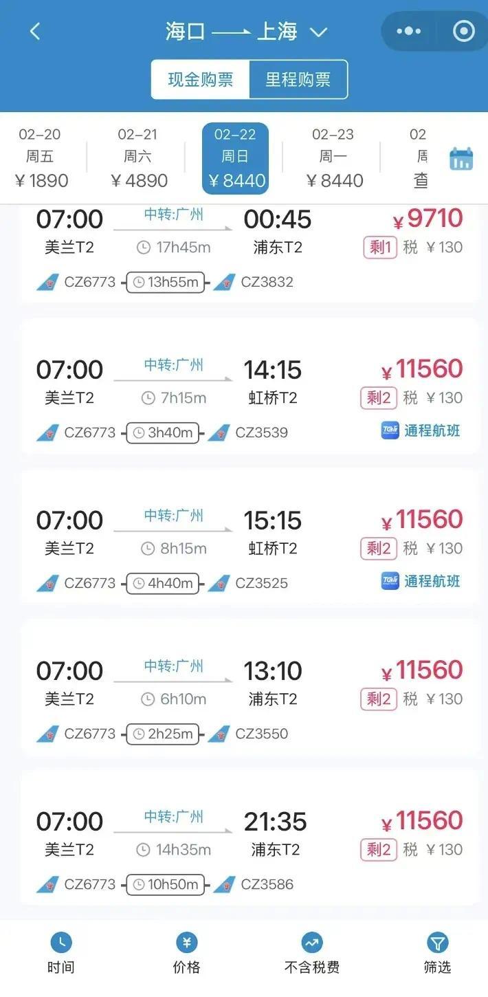 记者从航旅纵横大数据平台了解到,海口、三亚、昆明作为热门避寒游目的地,春节机票预订量实现稳 定增长。 2月22日至23日,海口至上海航线经济舱已全部售罄,仅余少量全价公务舱,最高票价达11560元(不含 税费)。海口、三亚至杭州航线经济舱已全部售罄,只剩少量公务舱票价近万元(不含税)。 春节假期的未来几天,海南出岛交通将迎来返程高峰。目前,机票、轮渡车票均已出现紧张态势。其中 琼州海峡过海出岛车票已全部售罄,部分航线机票告急。 "我们通过内部系统实时监控票价波动,确保春运期间票价处于合理区间。"海南航空工作人员表示,高 峰时段的机票价格相对稳定,所有国内航班经济舱票价均严格按备案价格体系执行。 | 三亚一杭州 ▼ | | | | | --- | --- | --- | --- | | 公务/头等舱 1成人 | | | | | 周六体 周一体 | 周日休 | 周二 | 周三 | | 21 02-23 | 22 | 24 | 25 | | 筛选 1 下午出发 | 只看直飞 | | 机场 ▼ 大型机 | | 高性价比 | | | | | 06:45 | 成都转 | 21:50 | 少量 ¥6980¥6925 | | ...