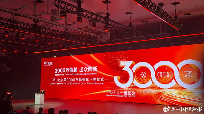 【我国首家3000万辆乘用车企诞生!中国汽车工业高质量发展迈入新篇章】10月30日,一汽-大众第 3000万辆整车下线仪式于10月30日在长春举办。这标志着一汽-大众正式成为国内首家产销突破3000万 辆的乘用车企业。《中国经营报》记者现场看到为了庆祝这个中国乘用车的"大日子",一汽-大众将会 场布置成了历史回廊,展现从一台车、一个品牌到三个品牌,30余款车的历史性跨越。@新浪新能源 (中经记者 张硕) ...