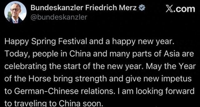 春节期间,德国总理默茨在社交媒体上表达了新春祝福,称"愿马年为德中关系注入力量、带来新动 力",并对访华表示期待。社交媒体平台"X"截图 国际形势的变化,让德国认识到进一步提升对华关系的重要性。春节期间,默茨在社交媒体上表达了新 春祝福,称"愿马年为德中关系注入力量、带来新动力",并对访华表示期待。"默茨从未为某次出访进 行过如此精心的准备。"德国《明镜》周刊称,默茨花了大量时间倾听德国外交部、经济部等部门关于 对华关系的意见,还邀请了一些知情人士到总理府共进晚餐,就访华相关事宜进行深入沟通。 据《明镜》报道,默茨在基民盟党代会上宣布,他将率领一支"庞大的商务代表团"访华。他强调:"如 今,外交政策也是对外经济政策,而后者是我们经济政策的核心组成部分。" 这支商务代表团包括来自拜尔、德国商业银行、大众、宝马、奔驰、西门子、汉高、DHL等公司的约 30位高级商业代表。德媒称,希望与默茨同行的商界高管人数远远超过这个数字。 "近期,中国连续接待了携经济代表团来访的高级政治人物:法国总统马克龙、英国首相斯塔默、加拿 大总理卡尼,还有爱尔兰和芬兰的客人。很快,德国总理默茨也将到访中国……这些访问不仅是常规外 交活动。 ...