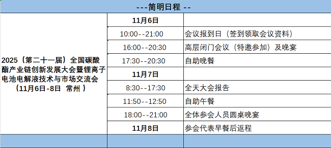 破卷重构,立新启航 在行业跌宕前行、身处挑战与机遇交汇的关键路口,2025(第二十一届)中国碳酸酯产业链创新发展大会 暨锂离子电池电解液技术与市场交流会的召开恰逢其时。面对产业发展需求,大会以技术创新、产品创 新、供应链创新为核心抓手,聚焦增量扩容与市场需求精准对接,倡导企业协同合作以激发产业活力。 本次大会不仅为行业注入新动能,更围绕新质生产力培育展开深度探讨,为企业破解发展难题提供切实 思路,为碳酸酯、电解液产业未来发展指明清晰方向,助力行业在变革中找准定位、突破瓶颈,迈向高 质量发展新阶段。 一 大会组织机构 主办单位:《中国化工报》社有限公司 碳酸酯产业智库 | --- 简明日程 -- | | | | | --- | --- | --- | --- | | 11月6日 | | | | | 会议报到日(签到领取会议资料) | 10:00 -- 21:00 | | | | 高层闭门会议(特邀参加)及晚宴 | 16:00 -- 20:30 | | | | 2025 (第二十一届) 全国碳酸 | 自助晚餐 | 17:30--20:30 | 酯产业链创新发展大会暨锂离子 | | 11月7日 | 电池电解液技术与 ...