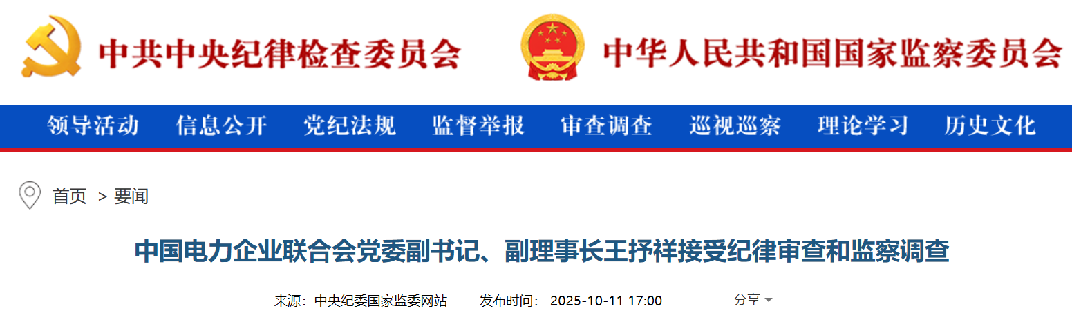 中国电力企业联合会党委副书记、副理事长王抒祥接受纪律审查和监察调查