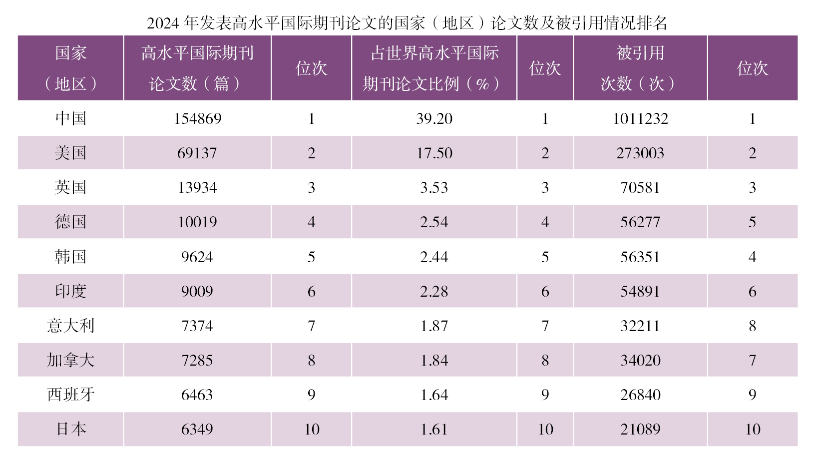 中国科学技术信息研究所(以下简称"中信所")今天发布2024年度我国科技论文统计结果。数据显示,2024年,我国各学科最具影响力期刊论文数量、高水 平国际期刊论文数量及被引用次数继续保持世界第1位。 2024年度我国科技论文统计工作已经完成,统计结果发布如下: 一、我国各学科最具影响力期刊论文数量、高水平国际期刊论文数量及被引用次数继续保持世界第1位 各学科影响因子最高的期刊可以被看作世界各学科最具影响力期刊,2024年178个学科中高影响力期刊共有163种(含学科交叉期刊),2024年各学科最具影 响力期刊上的论文总数为42757篇,中国在这些期刊上发表的论文数为15067篇,占世界总量的35.2%,排在世界第1位。 高水平国际期刊论文是指发表在经遴选的世界各学科代表性科技期刊上的论文,该类期刊须同时符合"影响因子和总被引用次数同居本学科前10%"及"每年 刊载的学术论文及述评文章数大于50篇"两项标准。2024年共有377种国际科技期刊入选世界各学科代表性科技期刊,发表高水平国际期刊论文39.51万篇。 按第一作者第一单位统计分析的结果显示,中国发表高水平国际期刊论文15.49万篇,占世界总量的39.2% ...