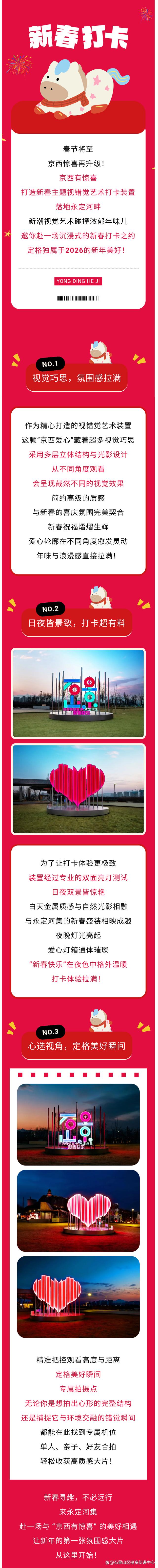春节将至 京西惊喜再升级! 京西有惊喜 打造新春主题视错觉艺术打卡装置 落地永定河畔 新潮视觉艺术碰撞浓郁年味儿 邀你赴一场沉浸式的新春打卡之约 定格独属于2026的新年美好! 新春祝福熠熠生辉 爱心轮廓在不同角度愈发灵动 年味与浪漫感直接拉满! I A NO.2 日夜皆景致,打卡超有料 为了让打卡体验更极致 装置经过专业的双面亮灯测试 日夜双景皆惊艳 白天金属质感与自然光影相融 与永定河集的新春盛装相映成趣 夜晚灯光亮起 爱心灯箱通体璀璨 "新春快乐"在夜色中格外温暖 打卡体验拉满! N0.3 心选视角,定格美好瞬间 新春打卡 大 YONG DING HE JI ||||||| || ITA NO.1 视觉巧思,氛围感拉满 作为精心打造的视错觉艺术装置 这颗"京西爱心"藏着超多视觉巧思 采用多层立体结构与光影设计 从不同角度观看 会呈现截然不同的视觉效果 简约高级的质感 与新春的喜庆氛围完美契合 来源:北 京号 作者: 石景山区投资促进中心 ■ . . ● The B ll F IP T add 6 44 ...
