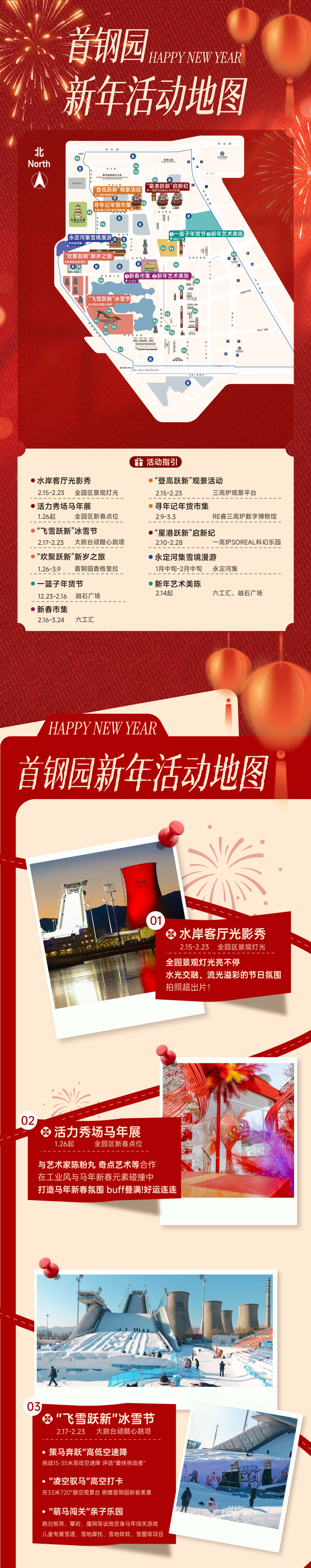 E HAPPY NEW YEAR 新年活动地图 北 03) North R i 活动指引 ● 水岸客厅光影秀 ●"登高跃新"观景活动 2.15-2.23 _____ 2.15-2.23 全园区景观灯光 三高炉观景平台 ● 寻年记年货市集 ● 活力秀场马年展 1.26起 全园区新春点位 RE容三高炉数字博物馆 2.9-3.3 ●"飞雪跃新"冰雪节 ●"星港跃新"启新纪 一高炉SOREAL科幻乐园 2.17-2.23 大跳台顽酷心跳塔 2.10-2.28 ●"欢聚跃新"新岁之旅 ● 永定河集雪境漫游 1.26-3.9 首钢园香格里拉 1月中旬-2月中旬 永定河集 ●一篮子年货节 ● 新年艺术美陈 六工汇、融石广场 2.14起 12.23-2.16 融石广场 ● 新春市集 2.16-3.24 六工汇 HAPPY NEW YEAR 首钢园新年活动地 8 水岸客厅光影秀 2.15-2.23 全园区景观灯光 全园景观灯光亮不停 水光交融、流光溢彩的节日氛围 拍照超出片! 02 ® 活力秀场马年展 1.26起 全园区新春点位 与艺术家陈粉丸 奇点艺术等合作 在工业风与马年新春元素碰撞中 打造马年新春氛围 buff叠满!好运 ...