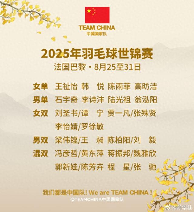 转自:北京日报客户端 据@TEAMCHINA中国国家队 ,2025年羽毛球世锦赛将于8月25日至31日在法国巴黎举行。逐梦巴黎, 国羽再出发!一起为他们加油! | * FOR | | --- | | 中国互交队 | | 2025年羽毛球世界 | | 法国巴黎 · 8月25至31日 | | で車 王社怡 韩 悦 陈雨菲 高防洁 | | 男单 石宇奇 李诗注 陆光祖 翁泓阳 | | 刘圣书/谭 宁 贾一凡/张殊贤 P | | 李怡婧/罗徐敏 | | 梁伟铿/王 FREA | | 混双 冯彦哲/黄东萍 蒋振邦/魏雅欣 | | 郭新娃/陈芳卉 程 星/张 驰 | | 我们都是中国队! We are TEAM CHINA ਨੇ | | TEAM CHINA @TEAMCHINA中国国家队 | 来源:@ 新华社 ...