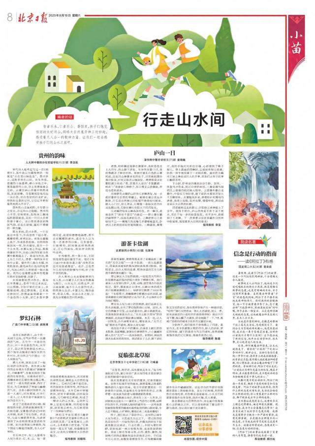 转自:北京日报客户端 编者的话 智者乐水,仁者乐山。暑假里,孩子们饱览祖国的大好河山,领略大自然鬼斧神工的妙趣,感受着天人 合一的精神力量。让我们一起去感受孩子们的山水之旅吧。 信念是行动的指南 ——读《阿拉丁》有感 回龙观二小五(4)班 黄奕茹 暑假里,我读了《阿拉丁》的故事。这是一个阿拉伯民间神话,十分有趣又令人深思。 故事的主人公阿拉丁,起初是个沉迷吃喝玩乐的街头小混混,既没有踏实做事的态度,也没有明确的目 标,日子过得浑浑噩噩。直到魔法师带着"寻宝"的诱惑找到他,阿拉丁才半推半就地走进神秘洞穴。面 对满洞的金银珠宝,他一下子被贪婪冲昏了头,忘了魔法师"只能拿神灯,别碰其他宝物"的叮嘱,伸手 去抓一堆宝石。正是这种浮躁又短视的态度,让他被魔法师关在洞穴里,差点儿出不来。 当他意外拿到神灯,在精灵的帮助下过上富足生活后,态度慢慢变了。看到公主为百姓的难处操心,他 突然意识到:我不能一辈子靠精灵活着,这样和以前混日子有什么区别?这个想法成了新的信念,他开 始主动学知识、练本事,关心起身边人的生活。 后来,神灯被魔法师偷走,公主也被抢走了。曾经的"小混混"下定决心夺回神灯,保护公主。这份信念 指引着他一步步行 ...