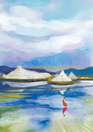 史家胡同小学四(15)班 马秉坤 趁着放暑假,爸爸带我走进了青藏高原上著名的"天空之镜"——茶卡盐湖。一进入盐湖景区,带着淡淡 咸味的微风便轻柔地拂过脸颊。放眼望去,洁白无垠的盐滩、明净淡蓝的天空与清澈平静的湖水融为一 体。 穿过景区入口处的画廊,一组组高大的灰白色盐雕在高原强烈的阳光照射下熠熠生辉。我们乘坐小火车 穿行其中,人物、动物、建筑等杰作依次掠过。其中,那座高达10多米、长逾50米的成吉思汗组雕最震 撼人心。导游说它耗费了5800吨盐!下车细看时,我触摸着它粗糙冰凉的表面,感受着雕刻大师们倾注 的心血与汗水,不由得在心中为他们喝彩。 看完令人叹为观止的盐雕群,我们沿着长长的木质栈道,走向了梦幻般的湖心区域。这里,天空仿佛触 手可及,云朵轻盈洁白,湖水清澈见底,完美地倒映着蓝天白云。"天光云影共徘徊"的诗意画面,此刻 就在眼前真实铺展。水天一色,让人一时恍惚,分不清哪里是天,哪里是水。"天空之镜"果然名不虚 传,真如人间仙境! 我按捺不住心中的激动,迅速套上鲜红的防水鞋套,卷起裤脚,紧紧拉住爸爸的手,小心翼翼地踏入这 片"天空"——浅水体验区。刹那间,清凉的湖水温柔地将我包围。我试着走了几步,脚下是松 ...
