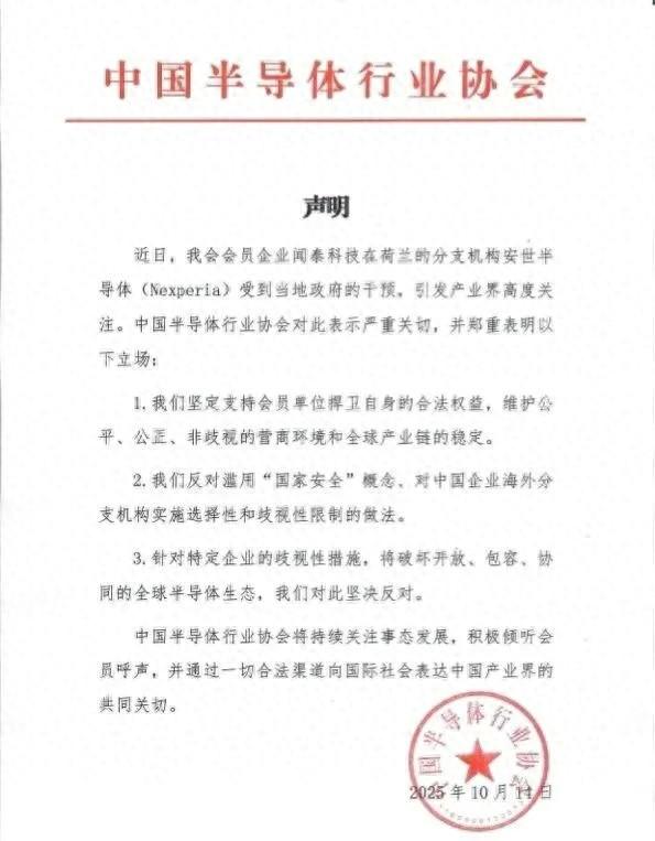 Core Points - The China Semiconductor Industry Association expressed serious concern over the intervention by the Dutch government regarding Nexperia, a subsidiary of Wentech Technology [1][3] - The association firmly supports its member companies in defending their legitimate rights and maintaining a fair and non-discriminatory business environment [1] - The association opposes the misuse of the "national security" concept to impose selective and discriminatory restrictions on Chinese companies' overseas branches [1] - Discriminatory measures against specific companies are seen as detrimental to the open and collaborative global semiconductor ecosystem [1] Company Responses - Wentech Technology issued a strong statement opposing the politicalization of commercial issues, criticizing the Dutch government's actions as excessive intervention based on geopolitical bias rather than factual risk assessment [3] - The company highlighted that the Dutch government's global operational freeze on Nexperia, justified by unfounded "national security" concerns, contradicts the EU's principles of market economy and fair competition [3]
