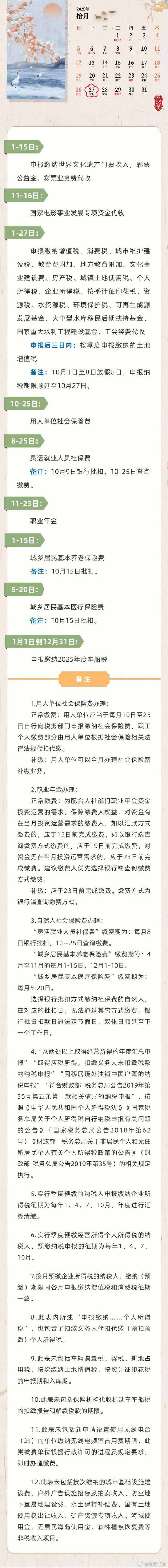 转自:北京日报客户端 | 2025年 拾月 | | | | | | | | --- | --- | --- | --- | --- | --- | --- | | | | | | ក | 71 | | | | | | 国庆节 | tn | ే య | | | 5 H-PH | 0 中秋边 | 十六 | 8 寒風 | 9 十八 | 10 十九 | 11 | | 12 | 13 #二 | 14 #三 | 15 41 M | 16 41 म | 17 #六 | 18 HF | | 19 | | 21 | | | 24 | 25 | | 甘八 | 20 #九 | 80- | 22 | 23 省降 | Fille | लो Ti | | 26 | 9 初七 | 28 初川 | 29 重用节 | 30 501-4- | 31 +- | | 业建设费、房产税、城镇土地使用税、个人 所得税、企业所得税、按季计征印花税、资 源税、水资源税、环境保护税、可再生能源 发展基金、大中型水库移民后期扶持基金、 国家重大水利工程建设基金,工会经费代收 申报后三日内:按季度申报缴纳的土地 增值税 备注:10月1日至8日放假8日,申报纳 税 ...