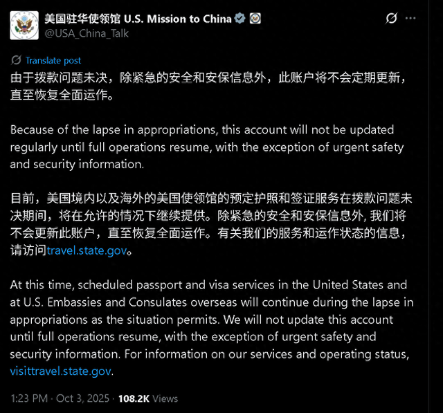 转自:北京日报客户端 美国驻华使领馆:拨款出问题,不会定期更新了。 北京时间10月3日下午1时23分,美国驻华使领馆在美国社交平台X上的官方账号上宣布,由于拨款问题 未解决,除紧急的安全和安保信息外,此账户将不会定期更新,直至恢复全面运作。 此前,由于美国国会两党无法就延长联邦政府资金的临时拨款法案达成一致,美国政府已经于当地时间 10月1日凌晨零时起陷入"停摆"状态。 来源:环球时报 ...
