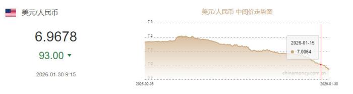 1月30日人民币对美元中间价报6.9678 上调93个基点