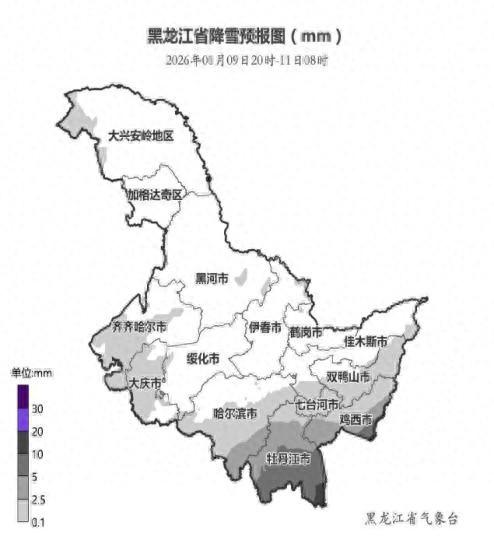 中新网哈尔滨1月9日电 (记者 姜辉)俗话说"夏练三伏,冬练三九",9日时值"三九"第二天,位于中国北 疆的黑龙江省迎来降雪、降温天气。9日14时,哈尔滨市气象台发布寒潮蓝色预警信号,预计未来48小 时主城区及各区、县(市)大部最低气温将下降8℃至12℃,10日夜间最低气温呼兰、巴彦、木兰、通 河-32℃至-29℃,其他区域-28℃至-25℃。 龙江省累计降雪量预报图。 黑龙江省气象局供图 黑龙江省气象台发布的天气预报信息显示,受高空槽东移及地面气旋共同影响,9日夜间至10日,齐齐 哈尔南部、大庆、哈尔滨东部、佳木斯南部、双鸭山、七台河、鸡西、牡丹江累计降雪量0.5毫米至4.5 毫米,其中哈尔滨东南部、鸡西南部、牡丹江局地5毫米至9毫米,个别乡镇可达10毫米至12毫米。东部 地区新增积雪深度3厘米至8厘米,其中鸡西南部、牡丹江南部8厘米至12厘米。 降雪过后,黑龙江省中东部地区降温幅度将达4℃至6℃,东南部部分地区降温可超过8℃。11日后,黑 龙江省气温维持较低,对交通、畜牧业、设施农业、能源保供及公众健康影响较大,请提前做好应对准 备。(完) 2026年1月9日20时至11日8时黑 ...