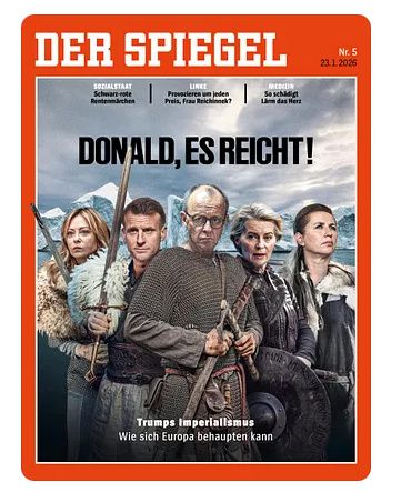 封面图上展示了五位欧洲领导人的照片,德国总理默茨、法国总统马克龙、欧盟委员会主席冯德莱恩、 丹麦首相弗雷泽里克森和意大利总理梅洛尼,他们被画成身穿猎人服装,手持武器的形象,背后背景看 似是格陵兰岛冰川。 此前报道,近日,美国总统唐纳德·特朗普宣布自2月1日起,将对丹麦、挪威、瑞典、法国、德国、英 国、荷兰和芬兰的输美商品加征10%的关税,并威胁若不就美国"全面、彻底购买格陵兰岛"达成协议, 自6月1日起税率将提高至25%。 美国的关税讹诈引发欧洲国家的同声谴责与团结应对。1月18日,上述欧洲8国发表联合声明称,美方威 胁加征关税破坏跨大西洋关系,可能引发危险的恶性循环。 中新网1月28日电 德国《明镜》周刊近日发表的最新一期标题显示:"唐纳德,够了!" 图片来源:德国《明镜》周刊报道截图 封面底部写道:"特朗普的帝国主义""欧洲如何捍卫自己的立场"。 ...