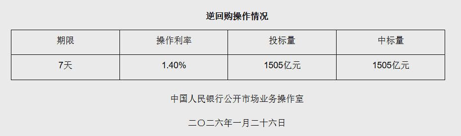 图片来源:央行网站截图 | 期限 | 操作利率 | 投标量 CONTRECT FOR | 中标量 | | --- | --- | --- | --- | | 7天 | 1.40% | 1505亿元 | 1505亿元 | 中新网1月26日电 据央行网站消息,2026年1月26日中国人民银行以固定利率、数量招标方式开展了1505亿元7天期逆回购操作。具 体情况如下: ...