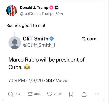 据此前报道,特朗普11日再次对古巴施压,威胁该国若不尽快"达成协议",将面临"零石油、零资金"流 入的局面。 (文章来源:中国新闻网) 据报道,特朗普在其社交平台"真实社交"(Truth Social)上回应了一名用户早些时候发布的一则帖文,内 容写道"鲁比奥将成为古巴总统"。特朗普转发时附上评论:"我觉得不错!" 报道称,鲁比奥生于迈阿密,其父母都是古巴人,于1956年移民美国,他长期以来一直支持美国对古巴 实施制裁。 另据美媒报道,特朗普还在社交平台上发布了一张图片,图上写着"委内瑞拉代总统"。美国消费者新闻 与商业频道(CNBC)指出,特朗普发布的这张图片在网上广泛传播,但其所宣称的说法并未在任何已核 实的公开记录中得到证实。 中新网1月12日电 据福克斯新闻当地时间11日报道,美国总统特朗普在社交平台上回应一则帖文,该贴 文称美国国务卿鲁比奥"将成为古巴下一任领导人"。 图片来源:特朗普社交媒体账号截图 ...