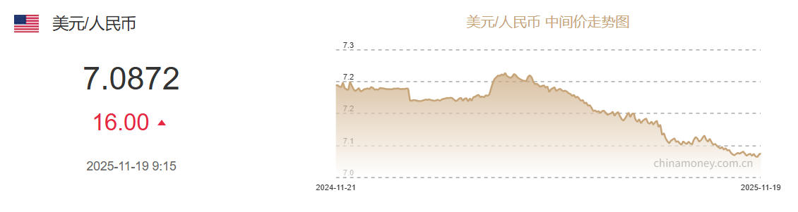 11月19日人民币对美元中间价报7.0872元 下调16个基点