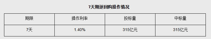 2月6日央行开展315亿元7天期逆回购操作 中新网2月6日电 据央行网站消息,2026年2月6日,中国人民银行以固定利率、数量招标方式开展了315 亿元7天期逆回购操作。 | | 7天期逆回购操作情况 | | | | --- | --- | --- | --- | | 期限 | 操作利率 | 投标量 | 中标量 | | 7天 | 1.40% | 315亿元 | 315亿元 | 来源:中国新闻网 编辑:郭晋嘉 广告等商务合作,请点击这里 本文为转载内容,授权事宜请联系原著作权人 中新经纬版权所有,未经书面授权,任何单位及个人不得转载、摘编或以其它方式使用。 关注中新经纬微信公众号(微信搜索"中新经纬"或"jwview"),看更多精彩财经资讯。 图片来源:央行网站截图 同时,以固定数量、利率招标、多重价位中标方式开展了3000亿元14天期逆回购操作。 ...
