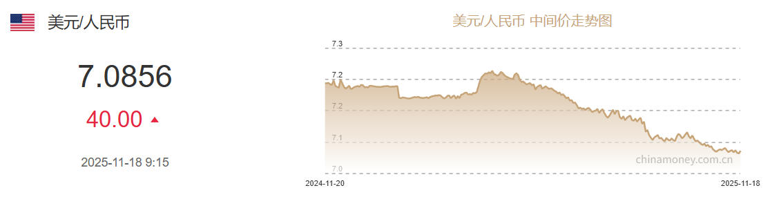 11月18日人民币对美元中间价报7.0856元 下调40个基点