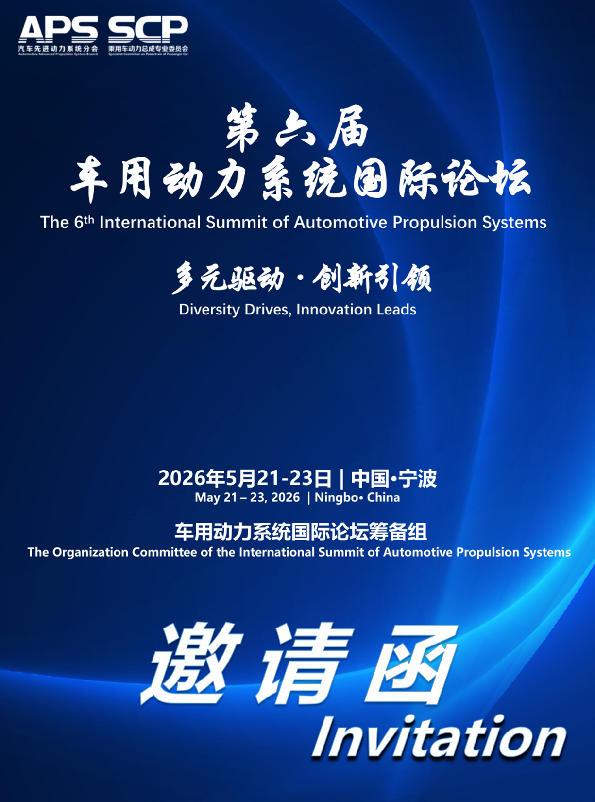 第六届 车用动力系统因际论坛 The 6th International Summit of Automotive Propulsion System 多元驱动 · 创新引领 Diversity Drives, Innovation Leads 2026年5月21-23日 | 中国・宁波 May 21 - 23, 2026 | Ningbo. China 车用动力系统国际论坛筹备组 The Organization Committee of the International Summit of Automotive Propulsion Sy 第六届车用动力系统图际论坛 The 6th International Summit of Automotive Propulsion Systems 尊敬的行业同仁: 您好! 当前全球汽车产业正处于变革的新阶段,车用动力系统作为产业转型的核心引擎,已形成电动化、混动化 多元能源协同发展的行业共识并取得巨大成就,同时迎来创新成果不断涌现的新时代。为深入探讨行业变革趋 第六届车用动力系统国际论坛将于2026年5月21-23日在中国宁波隆重召开。 本届大会围绕"多元驱动 ...