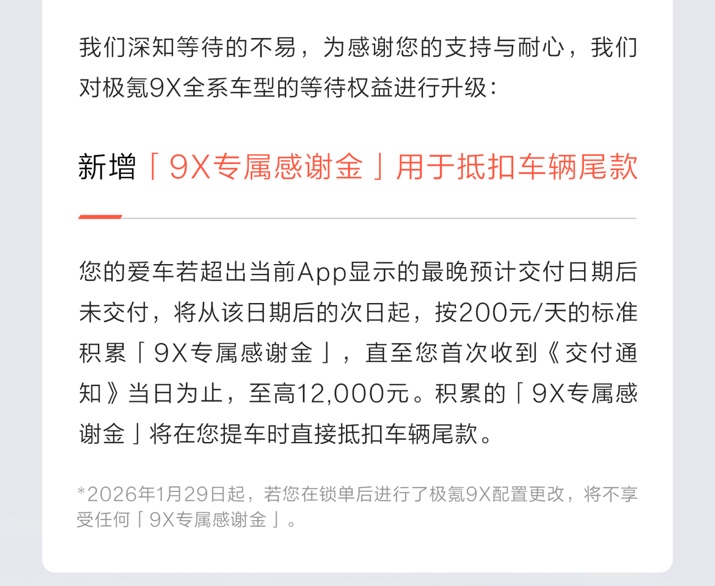 据悉,极氪9X自上市以来,热度持续走高,已连续两个月位居50万级以上大型SUV市场销冠,单车交付均价超53万元,成为中国品牌在该 价位段的标杆。极致的产品力,也吸引了海外关注。根据公开报道,因一车难求,极氪9X在多个海外市场上演加价潮,部分海外终端市场甚至 售价翻倍。 作为新一代豪华旗舰,9X搭载诸多行业领先的科技配置,这为产能快速提升带来了挑战。极氪方面表示,经过和供应链伙伴的共同努力, 部分零部件的产能爬坡已取得积极进展。 1月29日,记者获悉,面对持续火爆的订单和大量等车用户,极氪9X推出行业最高标准的等车权益。官方公告显示,若提车时间超过极氪 APP显示的预计交付最晚日期,极氪将按200元/天发放用户专属感谢金,直至交付通知当日,累积金额最高12000元,并可在提车时直接抵扣尾 款。 目前,极氪9X Max版和Ultra版提车周期缩短至2-6周,选装智能主动稳定杆的Ultra版交付周期为4-8周。而Hyper版与曜黑版交付周期也缩 短了4周,但因前期订单远超预期,仍需消化大量前序积压订单,交付还需一定时间。 业内人士分析,和同级其他品牌靠中低配走量不同,极氪9X的订单结构中顶配占比超过70%。Hype ...