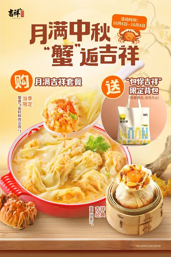 中秋月圆,国庆同庆,正是家人团聚、共享温馨的时刻。丰盛的团圆宴上,总少不了一碗热气腾腾 的馄饨,它不仅是暖胃的食物,更是团圆与幸福的象征。随着秋意渐浓,蟹肥菊黄,正是品尝蟹黄的最 佳时节。今年,吉祥馄饨以"蟹"为媒,匠心推出秋季限定产品——蟹黄飞鱼籽鲜肉云吞,将传统时令 美食与现代口味创新相结合,为消费者的节日餐桌再添一份浓情暖意。 26年真诚陪伴,以真材实料守护消费者期待 匠心新品,一口尽享秋日醇鲜 作为本次节日主推产品,蟹黄飞鱼籽鲜肉云吞在食材搭配与工艺上均体现出吉祥馄饨对品质的坚持 与创新精神。其核心亮点在于三重风味与口感的精妙融合:内馅精选肥糯流油的蟹黄,带来醇厚浓郁的 鲜香,每一口都仿佛浓缩了整个秋天的丰腴。另外添加晶莹饱满的飞鱼籽,入口后"咯吱咯吱"的Q弹质 感与嘭嘭爆香的体验,形成层次丰富的味觉惊喜。此外,云吞皮经过工艺改良,更薄且富有韧性,恰到 好处地锁住内馅的鲜美汁水。搭配以慢火熬制的醇厚骨汤汤底,整碗云吞从内到外,鲜香一体,温暖入 心。 凡购买该套餐的顾客,即可获赠"包你吉祥"限定帆布包一个,寓意"背上吉祥,好运随身"。赠品数 量有限,送完即止。本次活动旨在通过美食与好礼,传递"吃吉祥,背 ...