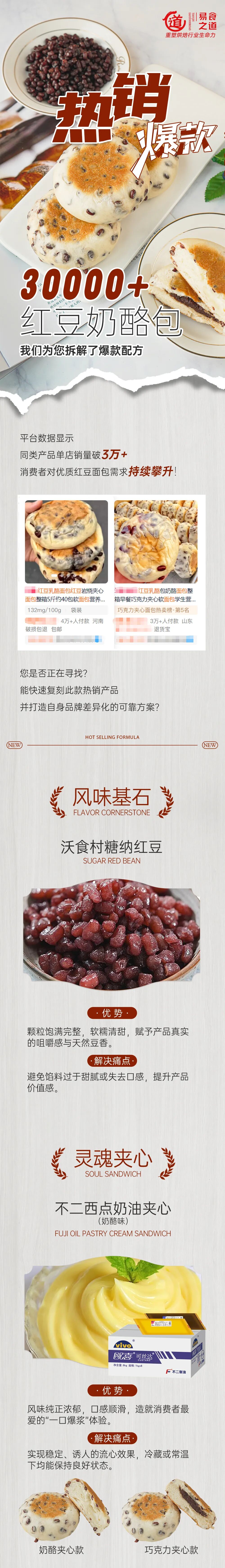 当"红豆奶酪包"在电商平台收获无数订单的时候、搜索热度持续攀升时这不仅是单品的胜利,更是优质原料与精准配方结合的市场验证。 易食之道讲此款爆品配方进行拆解,并匹配优质原料。 夏刻与曹舎 我们为您拆解了爆款配方 平台数据显示 同类产品单店销量破3万+ 消费者对优质红豆面包需求持续攀升! AVOR CORNERSTONE 沃食村糖纳红! SUGAR RED BEAN 红豆乳酪面包红豆岩烧夹心 面包整箱5斤约40包软面包营养 ... 132mg/100g | 袋装 4万+人付款 河南 破损包退 包邮 工豆乳酪包奶酪面包整 箱早餐巧克力夹心软面包学生营 ... 巧克力夹心面包热卖榜 ·第5名 3万+人付款 山东 退货宝 您是否正在寻找? 能快速复刻此款热销产品 并打造自身品牌差异化的可靠方案? HOT SELLING FORMULA FUJI OIL PASTRY CREAM SANDWICH (NEW NEW · 优 势 · 颗粒饱满完整, 软糯清甜,赋予产品真实 的咀嚼感与天然豆香。 ·解决痛点· 避免馅料过于甜腻或失去□感,提升产品 价值感。 灵魂头 SOUL SANDWIC 西点奶油夹心 (奶酪味) 食之道成 ...