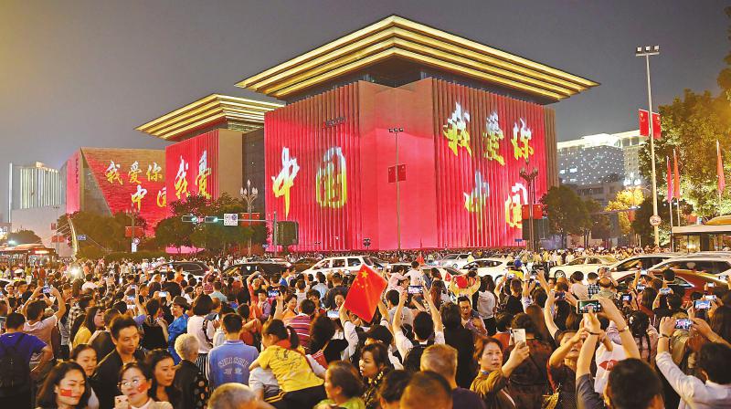 市民和游客们手举国旗自拍。 市民和游客们在灯光秀作品前留影。 一个小女孩脸上印着五星红旗的图案。 成都 光耀天府 彩绣蓉城 为庆祝新中国成立70周年,9月30日晚,成都市举行"光耀天府,彩绣蓉城"的大型灯光秀表演。 在天府广场,无数市民和游客聚集,观看四川大剧院、四川美术馆、四川省图书馆、成都博物馆等建筑上的大型 投影宣传画,以及展示成都特色的灯光秀。 据了解,成都1300余处景观照明设施已全面启动节日灯光秀表演。在环球中心、锦江公园等重要点位,利用景观 照明光影装置播放"热烈庆祝中华人民共和国成立70周年""我爱您中国"等主题画面。 锦江公园合江亭—东门码头—猛追湾、桂溪公园—环球中心、春熙路—太古里、宽窄巷子—琴台路、武侯祠—锦 里等旅游商圈景观照明氛围全面呈现,营造出热烈隆重的节日氛围。(记者 衡昌辉 摄) ...