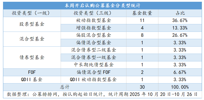 债券型基金发行维持平稳,本周共有3只债券新基开启认购,环比持平。其中,混合债券型二级基金、混合债 券型一级基金和中长期纯债型基金各1只。 QDII(合格境内机构投资者)基金发行则有所回暖,本周有1只QDII新基开启认购,而前一周开启认购的QDII 新基数量为零。 从机构角度来看,本周有27家公募机构旗下有新基开启认购,其中24家公募机构仅1只新基开启认购,另外3家 公募机构有2只新基开启认购。 公募产品发行有所降温。 10月20日,记者从公募排排网获悉,10月20日至10月26日全市场共有30只公募基金开启认购,较前一周环比下 降45.45%,平均认购天数为27.8天,较前一周明显延长。 | | 本周开启认购公募基金分类型统计 | | | | --- | --- | --- | --- | | 投资类型(一级) | 投资类型(三级) | 基金数量 | 长比 | | 股票型甚金 | 被动指数型基金 | 11 | 36. 67% | | | 增强指数型基金 | র্ব | 13. 33% | | 混合型甚金 | 偏股混合型基金 | 8 | 26. 67% | | | 偏债混合型基金 | 1 | 3. 33% | ...