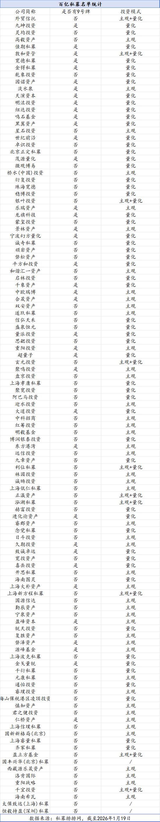 百亿私募阵营迎来"洗牌"。 1月20日,记者从私募排排网获悉,截至2026年1月19日,百亿私募数量已达114家,较2025年末增 加1家。尽管总量小幅扩容,阵营内部却有明显调整:2家机构退出百亿梯队,3家机构新晋或重返该行 列。 在2026年1月新晋或回归的3家私募中,遂玖私募早在2021年就已进入过百亿梯队,此次为时隔多年 重返。另外,国源信达和恒毅持盈(深圳)私募则为首次跻身百亿私募行列。从投资模式来看,其中2 家为主观策略私募,另有1家尚未公布投资模式。 值得关注的是,恒毅持盈(深圳)私募成立于2025年5月,并于同年8月完成备案。截至2025年底, 其管理规模仅为0至5亿元,而在2026年1月规模迅速攀升,一举突破百亿元。资料显示,该私募具有险 资背景,实际控制人为平安资产管理有限责任公司。目前,具有险资背景的私募共有3家,除恒毅持盈 外,还包括国丰兴华(北京)私募和太保致远(上海)私募。 从策略类型来看,量化策略在百亿私募中占据主流。数据显示,当前114家百亿私募中,量化私募 数量最多,达到55家,占比48.25%;主观策略私募有46家,占比40.35%;主观与量化混合策略私募有 10家,占比8. ...