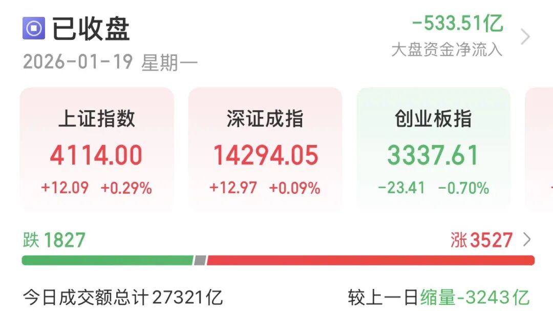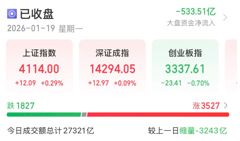 受访人士表示,今日市场表现温和,是政策护航下的"慢牛蓄力"特征。A股短期内或延续高位震荡格局,资金博弈延 续。配置上紧盯产业趋势硬、政策预期明、业绩兑现强的细分方向,同时警惕前期涨幅大、估值高的板块波动。 电力设备掀涨停潮 今日指数涨跌温和,沪指微涨0.29%报4114点,创业板指收跌0.7%报3337.61点,深证成指、沪深300、北证50微红, 科创50、上证50微跌。 1月19日,A股市场延续窄幅震荡,多数个股收红但分化加剧、轮动提速:电力设备领涨,航天航空反弹,AI应用继 续回调。 | 代码 | 名称 | . | 最新 | 涨幅% | 周涨幅% | 年初至今涨幅% | 成交额↓ | 总市值 所属行业 | | --- | --- | --- | --- | --- | --- | --- | --- | --- | | 600089 | 特变电工 | 1 | 30.50 | 66'6 | 9.99 | 37.26 | 219亿 | 1541亿 输变电设备 | | 002202 | 金风科技 | 1 | 27.70 | 2.44 | 2.44 | 35.78 | 186亿 | 1170亿 电源设备 | | ...