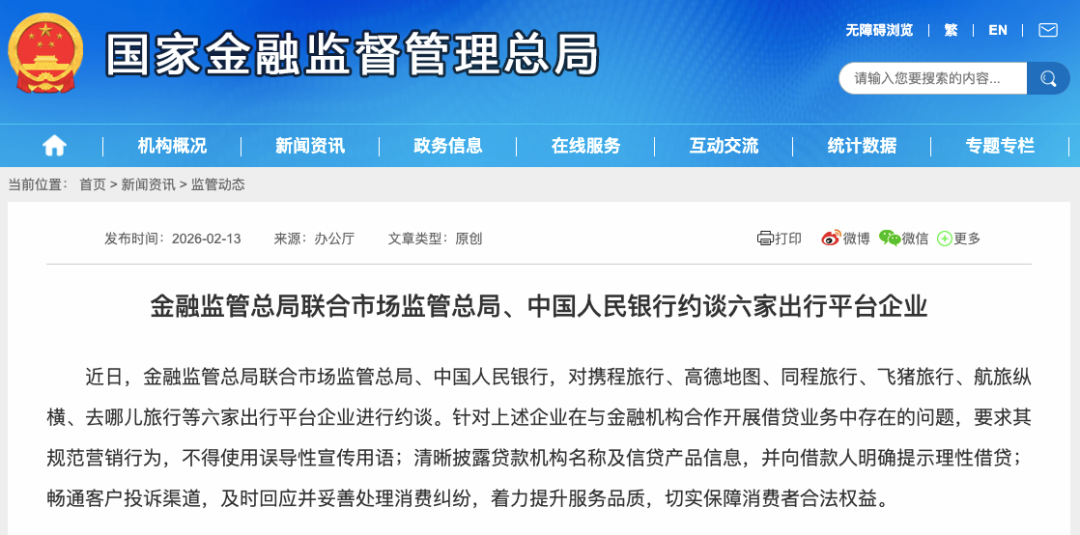 近日,国家金融监督管理总局联合国家市场监督管理总局、中国人民银行对携程旅行、高德地图、同程旅行、飞猪旅行、航旅纵横、去哪儿旅行等六 家国内主流出行平台企业进行约谈。 针对上述企业在与金融机构合作开展借贷业务中存在的问题,要求其规范营销行为,不得使用误导性宣传用语;清晰披露贷款机构名称及信贷产品信 息,并向借款人明确提示理性借贷;畅通客户投诉渠道,及时回应并妥善处理消费纠纷,着力提升服务品质,切实保障消费者合法权益。 六家企业均为国内用户规模庞大的头部出行服务平台,他们凭借自身独特的出行场景和高频的用户流量,成为金融市场中极具价值的合作渠道。其借 贷业务模式主要为"平台导流+金融机构放贷"的助贷模式,即平台本身不发放贷款,而是作为流量入口和技术支持方,为用户与持牌金融机构(如银行、 消费金融公司等)搭建桥梁。 此次约谈直指上述平台在助贷业务中存在的多项不规范行为,监管部门提出的整改要求主要涵盖以下四个方面: 一是严禁误导性宣传:严格规范自身营销推广行为,禁用诸如"免息""零首付"或模糊年化利率等易对消费者产生误导的宣传用语。 二是强化信息披露:向用户展示借贷产品时,必须清晰、显著地披露实际提供贷款的金融机构的全 ...