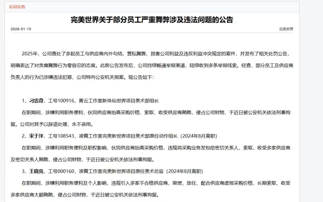 Core Viewpoint - Perfect World is intensifying its internal anti-corruption measures following multiple incidents of employee misconduct involving collusion with suppliers, emphasizing a zero-tolerance policy towards corruption and fraud [1][3] Group 1: Internal Corruption Cases - In 2025, Perfect World investigated several cases of employees colluding with suppliers, engaging in misconduct, and violating conflict of interest regulations, leading to legal actions against those involved [1] - Three individuals from the core art team of Perfect World, including leaders from the Qingyun and Lingxiao studios, have been criminally detained for misappropriating company assets [3] - The company has a history of addressing internal corruption, having previously reported multiple investigations involving both current and former employees in 2024 and 2025 [3] Group 2: Impact on Business Performance - Perfect World is currently in a performance recovery phase after experiencing a loss in 2024, but reported a revenue increase of 33% year-on-year in the first three quarters of 2025, totaling 5.417 billion yuan [3] - The company achieved a net profit of 666 million yuan in the same period, marking a turnaround from previous losses [3]