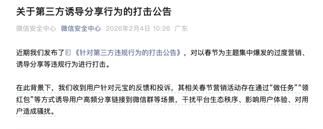 元宝春节红包活动第一轮刚结束,便遭遇不小的争议。 2月4日上午,微信官方信息账号"微信派"、微信安全中心均发布《关于第三方诱导分享行为的打击公告》称:"近期我们发布了《针对第三方违规行为的 打击公告》,对以春节为主题集中爆发的过度营销、诱导分享等违规行为进行打击。" 在此背景下,平台收到用户针对元宝的反馈和投诉,其相关春节营销活动存在通过"做任务""领红包"等方式诱导用户高频分享链接到微信群等场景,干扰 平台生态秩序、影响用户体验、对用户造成骚扰。 经研判,对元宝的违规链接进行处置,限制其在微信内直接打开。相关处置措施即日生效。 此前,腾讯旗下AI助手元宝于2月1日正式上线"春节10亿红包"活动,用户可在活动页面内直接抽取红包,或通过好友分享的红包链接、复制好友的红包口 令并在元宝App内打开等方式领取。 由于元宝红包打通微信和QQ的分享链,这一"撒钱"活动快速引发社交裂变传播,大量微信用户在群内分享元宝红包,甚至不少用户为抢红包专门建立群 聊。不过,元宝红包刷屏也在部分微信群内引发用户不满,且被质疑涉嫌诱导分享。 记者注意到,截至目前,微信内收到的元宝红包助力链接已经无法直接跳转到元宝App,点开后页面提示 ...