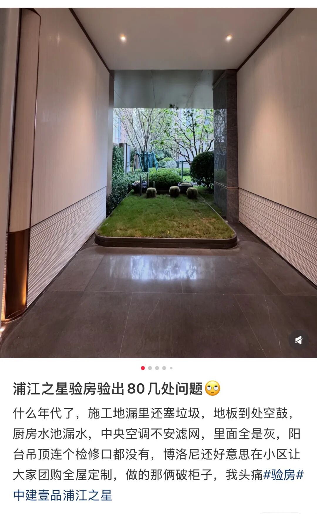 又有新盘面临业主"投诉"。 近日,位于杨浦东外滩板块的浦江之星迎来交付,但验房过程中存在的诸多问题,引发业主不满,要求项目整改。 根据业主拍摄的图片信息,在交付当天,浦江之星外立面就发生铝板脱落、围栏掉落现象,且项目架空层仍是毛坯状态、摆满了二手家具,公区还处 于没有建完的状态。 社交平台上,有业主发帖,称其验房验出80多处问题,包括施工地漏里塞垃圾、地板到处空鼓、厨房水池漏水、中央空调不安滤网、阳台吊顶没有检 修口…… 《国际金融报》记者近日实地走访浦江之星发现,正门入口处的栏杆尚未拆除,物料堆放在地,稍显混乱,和平常干净整洁、喜庆欢乐的交房现场形 成较大反差。 有业主反映,浦江之星存在重大设计缺陷,地面水泥摸起来是湿的,预看房的时候没有发现问题,但交房当天已经看到墙壁反碱,湿了半面墙,连厨 房下面瓷砖没有铺到的水泥部分也是湿的。别的地方后续也可能会慢慢泛出来。 回溯来看,2023年7月,中建三局透过旗下子公司中建壹品投资发展有限公司(下称"中建壹品"),以38.6亿元成功摘得上海市杨浦区定海社区I14-01 地块、I15-03、I15-02地块。 该项目总投资额近60亿元,总规划用地面积3.1万平方米,总 ...