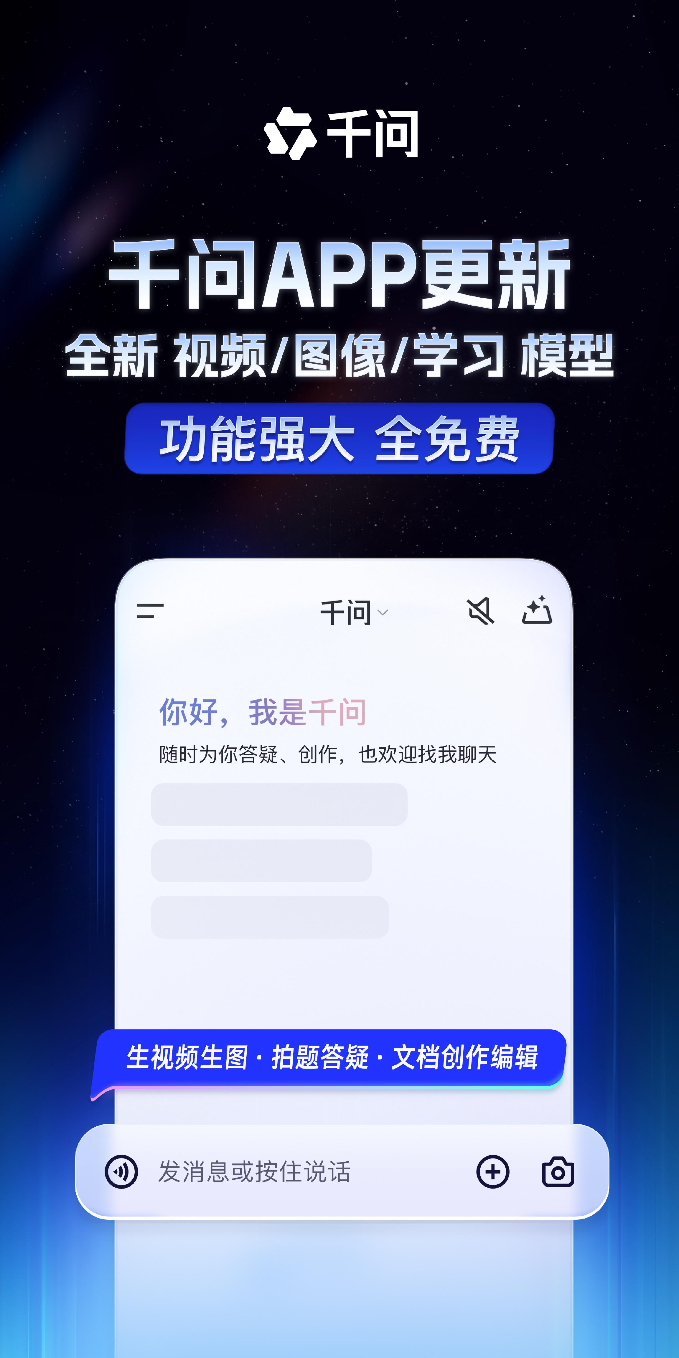 -7J F6 J5 生视频生图·拍题· 发消息或按住说 ( · D) 你好, 我是 随时为你答疑、创化 #千问上线阿里最强AI生视频模型#上线一周即破千万下载的千问APP持续迭代,藏着阿里All in AI的清晰路径。12月2日,千问上线了全新的AI生视频和生 图能力,搭载Qwen - Image 2511满血版,解决了中文图内处理、亚洲人像真实度等行业痛点;生视频则靠全新Wan2.5实现10秒音画同步的多人对话视频生 成,并且支持多语言。免费使用、玩法丰富,千问APP正通过高频迭代与低门槛体验,加速AI技术从实验室走向大众的步伐。 #千问上线阿里最强AI生图模 型满血版# ...