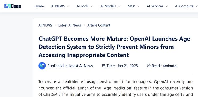 【环球网科技综合报道】1月21日消息,据AIBase报道,OpenAI近日宣布在ChatGPT消费级版本中正式 部署"年龄预测"功能,通过精准识别未满18岁用户并实施针对性保护措施,为青少年安全使用AI工具筑 牢防护屏障。 来源:环球网 针对被判定为未成年人的账户,ChatGPT将强制启用额外安全保护层,重点拦截五类高风险内容:直接 展示的暴力血腥画面;可能诱导未成年人模仿的危险病毒式挑战;涉及性或暴力的角色扮演;自残相关 描述;宣扬极端审美、不健康节食或身材羞辱的内容。同时,为应对模型可能出现的误判问题, OpenAI专门引入第三方身份验证服务Persona,被错误归类为未成年人的用户可通过上传自拍完成快速 验证,验证通过后即可恢复账号完整功能。 此外,该系统还为家长提供了"家长控制"定制功能,家长可根据实际需求设置孩子使用ChatGPT的"静 默时间"(即禁止使用时段),管控账号记忆功能权限,并且能在系统检测到用户出现急性心理困扰迹 象时及时接收通知,以便第一时间介入引导。(纯钧) 据了解,该年龄预测模型并非单纯依赖用户注册时填报的年龄信息,而是通过综合分析账户存续时间、 用户活跃时段(如是否频繁深夜使用 ...